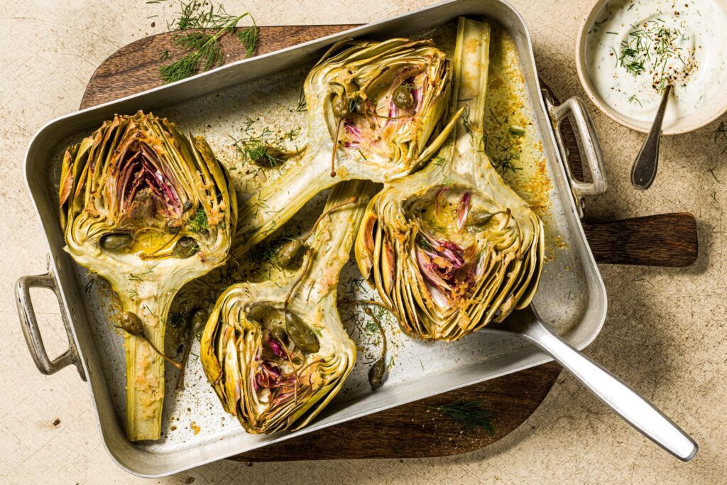 Couper les artichauts en deux dans le sens de la longueur et les badigeonner d'huile d'olive.